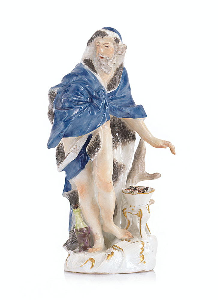 SCULTURA IN PORCELLANA, MEISSEN, 1750 CA., raffigurante allegoria dell'inverno, base a rocaille, decoro policromo e profili in oro.