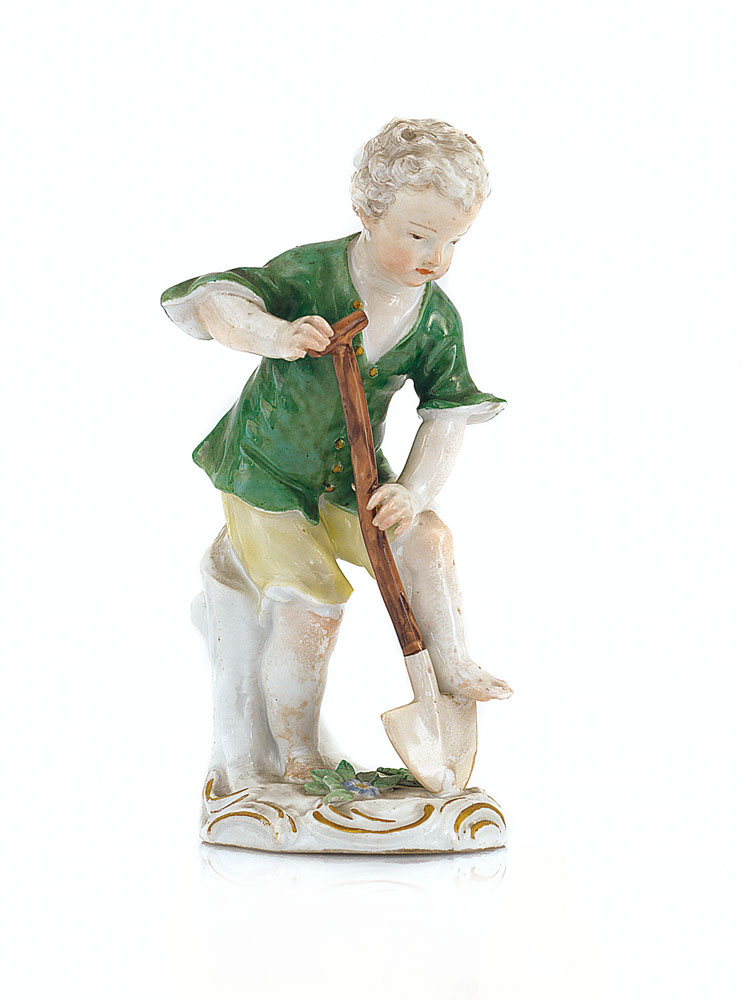 SCULTURA IN PORCELLANA, MEISSEN, 1750 CA., raffigurante putto giardiniere su base a zolla, decoro policromo.