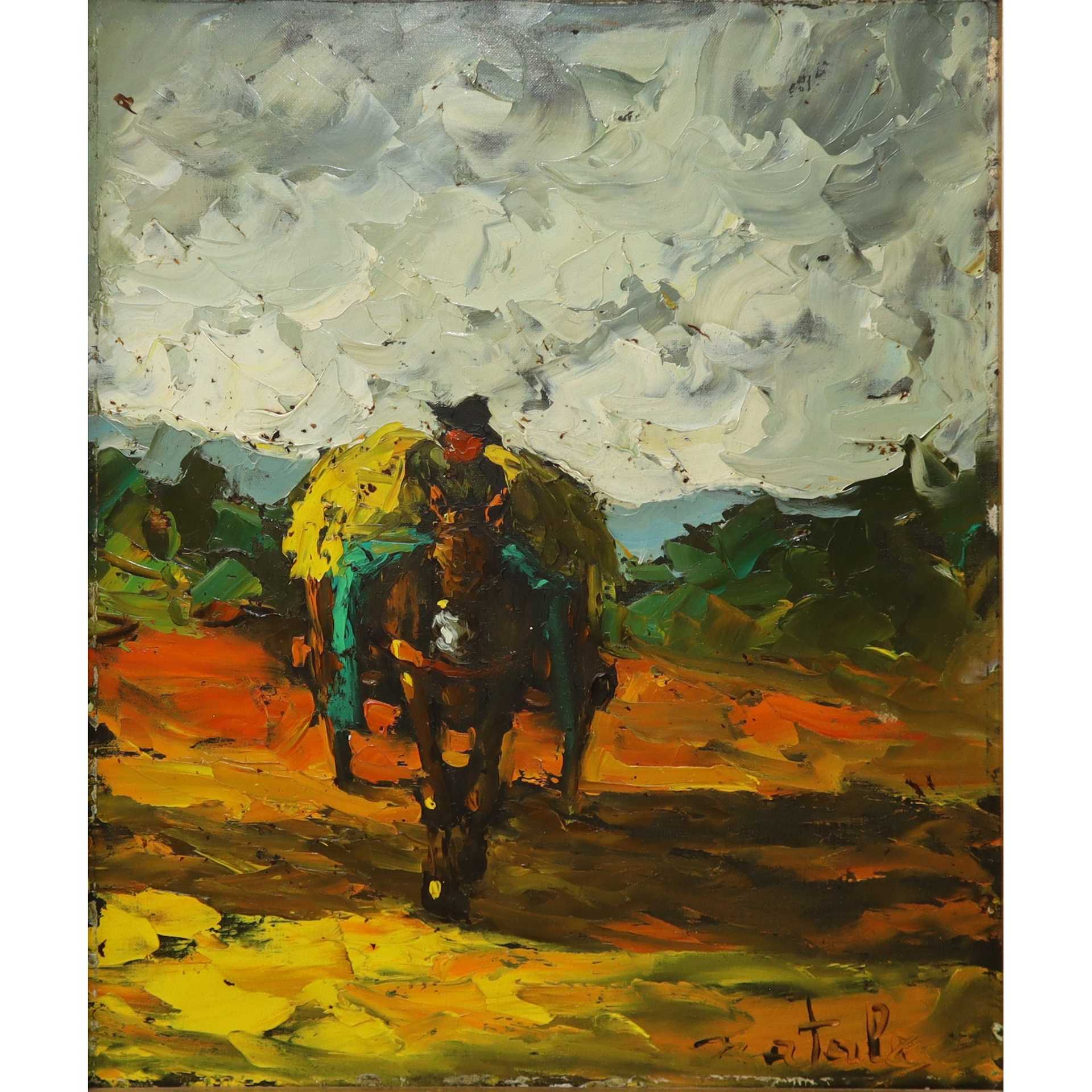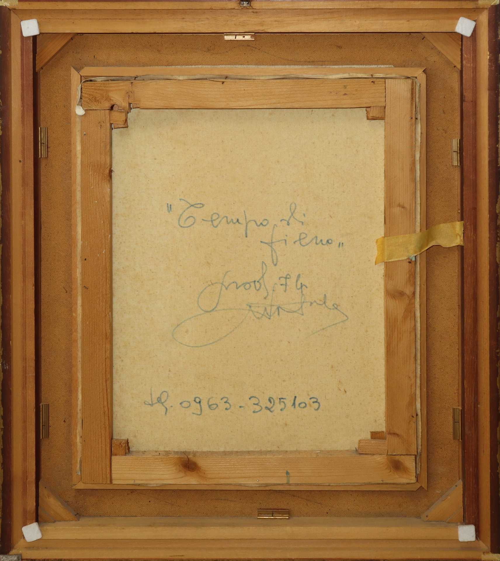 Tempo di fieno, '74 h cm 50x42 in cornice h cm 70X60 Tempera su tela Firmato in basso a destra Natale. Sul retro titolato e datato