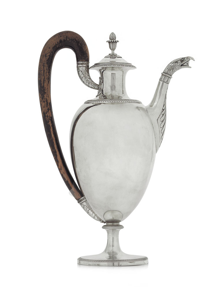 CAFFETTIERA IN ARGENTO, MILANO, 1815 CA., ARGENTIERE E.CABER, corpo ovoidale su base circolare con bordi a greche, palmette e perlinature, coperchio cimato da pigna, versatoio terminante a testa di rapace e manico a voluta in legno tinto.