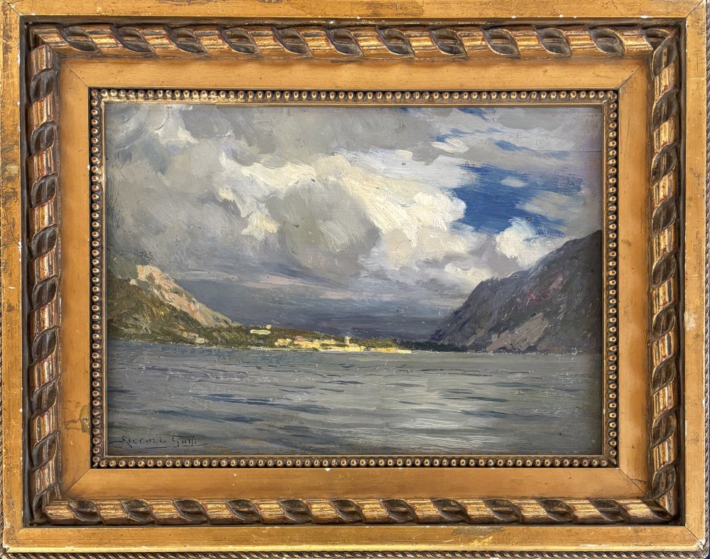 Riccardo Galli Milano 1869 - 1944 Barzio (LC) Temporale verso Lecco da Mandello Olio su tavola cm 24x35 firmato in basso a sx