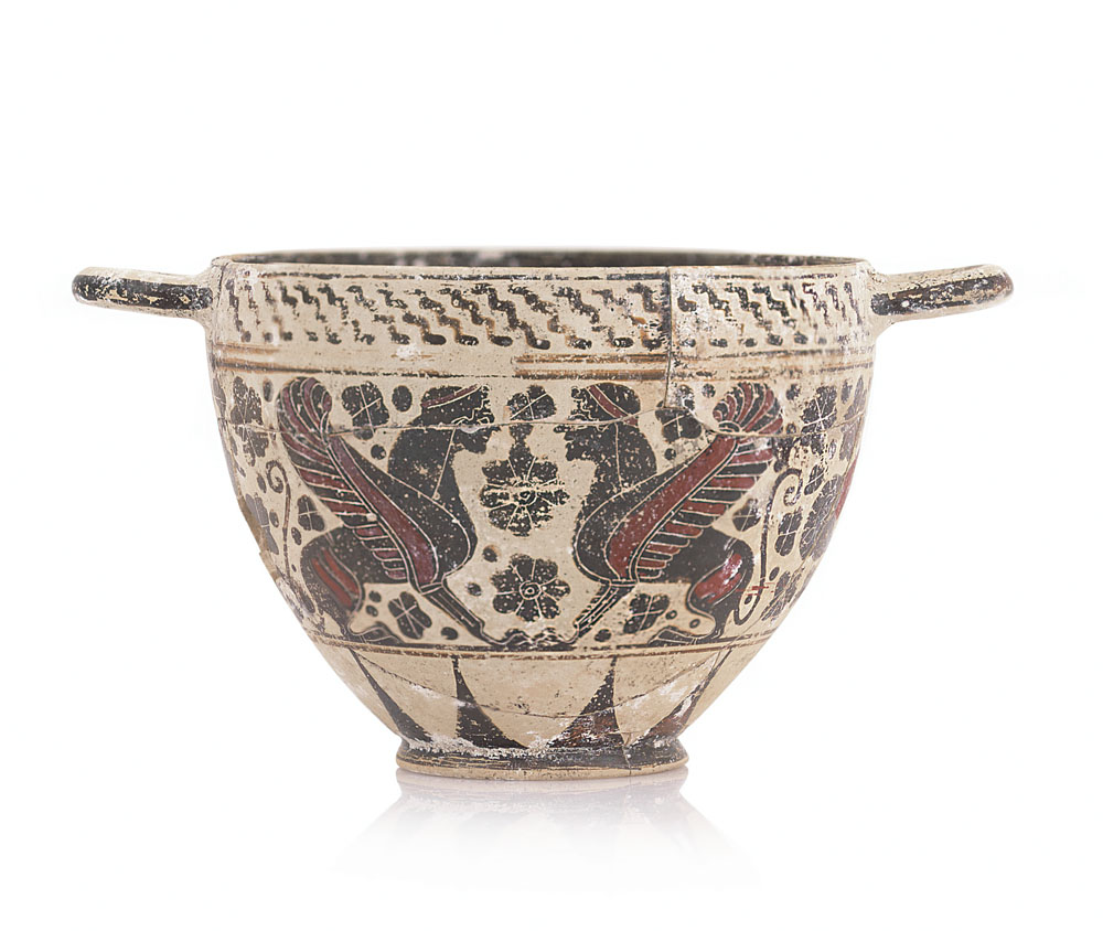 SKYPHOS ETRUSCO CORINZIO IN TERRACOTTA VERNICIATA, VI SEC. A.C., coppa a due anse piatte, decoro continuo ad animali e motivi fitomorfi entro riserve; danni, mancanze e usure.