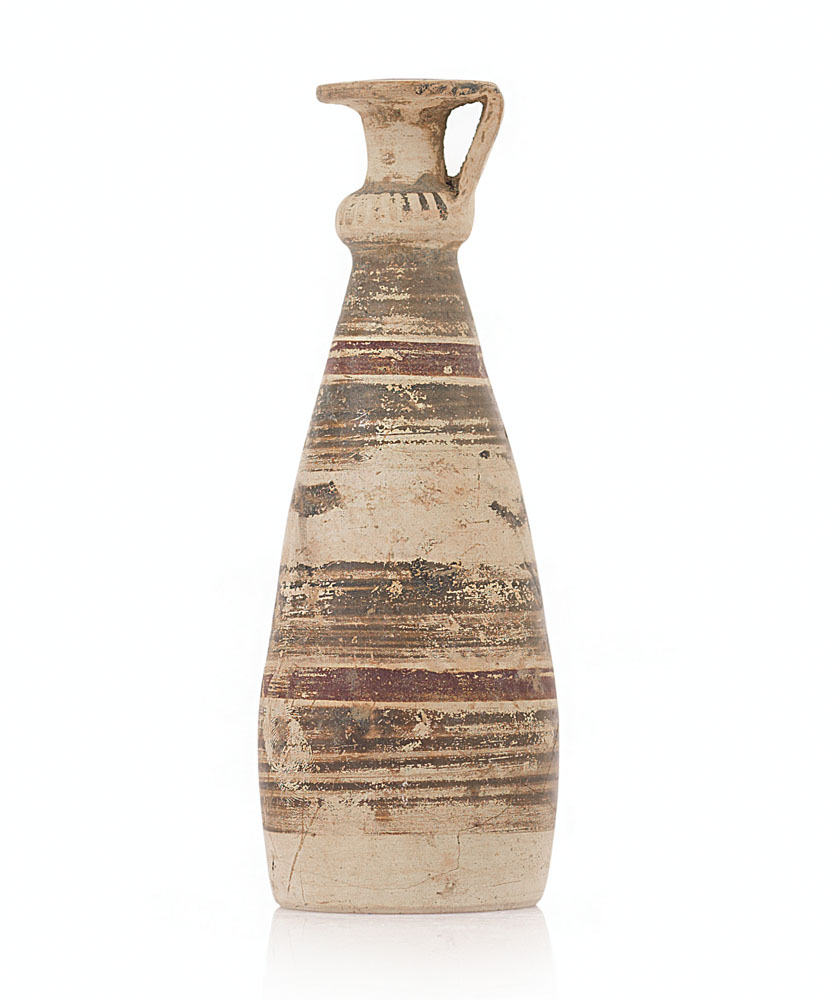 ALABASTRON ETRUSCO CORINZIO IN TERRACOTTA VERNICIATA, VI SECOLO A.C., piccola ansa su collo ad orlo piatto e decoro geometrico continuo bruno e rosso; usure e cadute di colore.