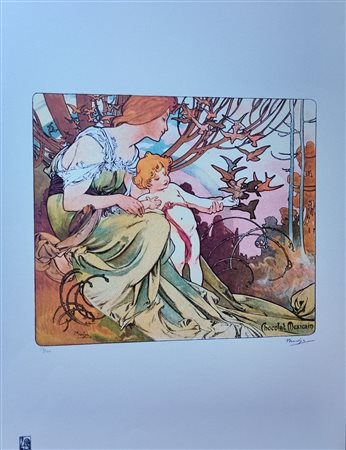 ALPHONSE MUCHA (1860-1939) Litografia CM 70X50 Titolo -Maternità- al Fronte Firma in Lastra in Basso a Destra e Tiratura a Matita in Basso a Sinistra, per Autentica Firma della Fondazione in Basso a Destra, Timbro a Secco e Certificato Accluso