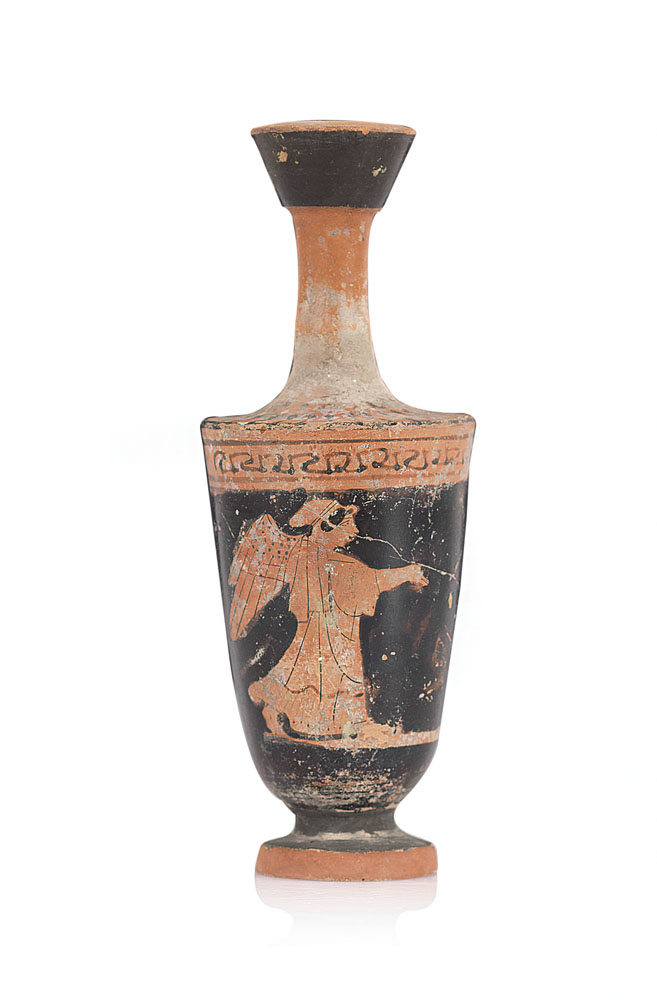 LEKYTHOS ATTICO IN TERRACOTTA VERNICIATA A FIGURE ROSSE, V SEC. A.C., collo svasato e base ad anello, decoro con Vittoria e motivi fitomorfi; mancanze e usure.