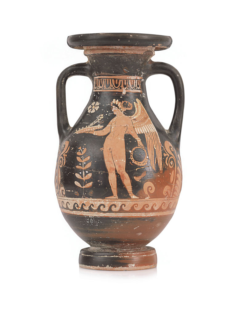 PELIKE APULA A FIGURE ROSSE IN TERRACOTTA VERNICIATA, MAGNA GRECIA, IV SECOLO A.C., piriforme biansata con labro svasato, decoro con figura di efebo nudo seduto reggente un "phiale" e una corona, sull'atro lato una fanciulla vestita con un cofanetto e una ghirlanda, palmette e ovoli; restauri.
