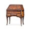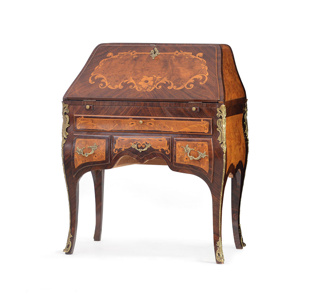 RIBALTINA INTARSIATA IN LEGNI VARI, XIX SECOLO, fronte e fianchi mossi, cassetti e calatoia celante cassettini interni, gambe arcuate, decori ad intarsio in legno chiaro a formare riserve mistilinee, fregi in bronzo dorato.
