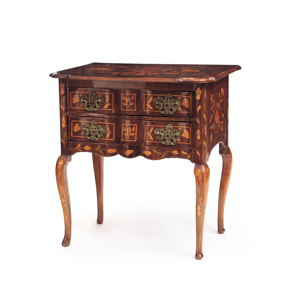 PICCOLO CASSETTONE INTARSIATO, OLANDA, XIX SECOLO, fronte mosso a due cassetti, piano sagomato, sostegni arcuati, decori floreali in legni vari; sbeccature e usure.