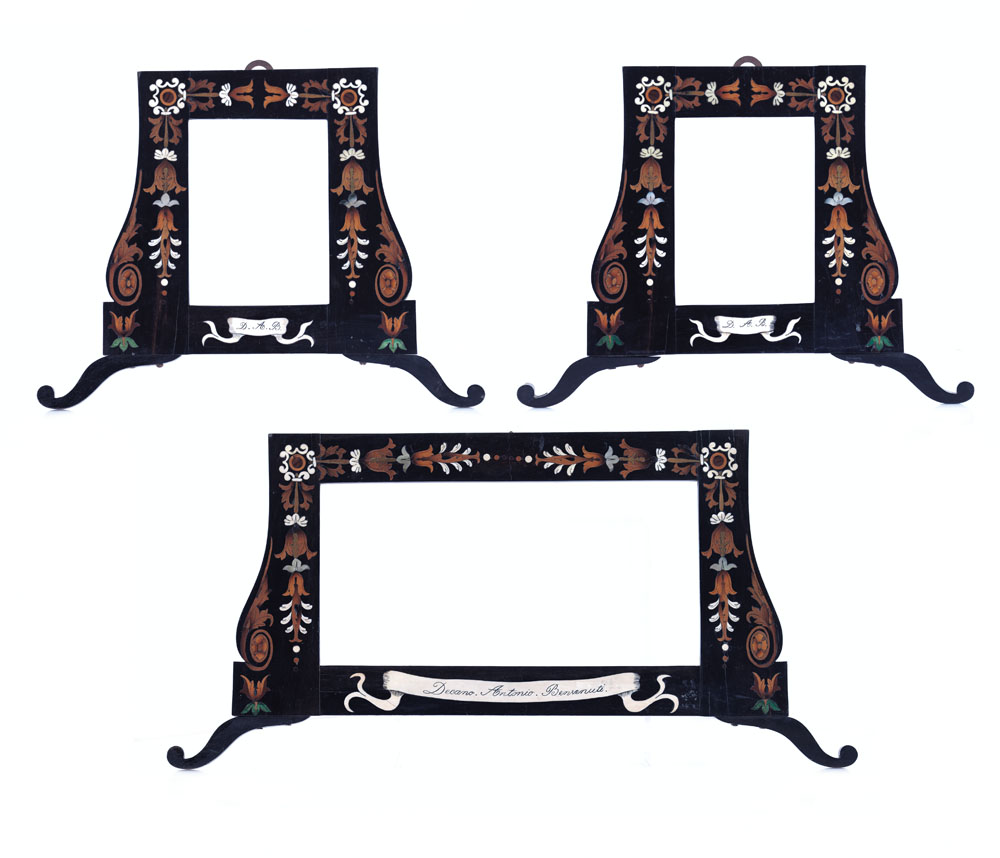 TRE CARTEGLORIA LASTRONATE IN EBANO CON INTARSI IN MADREPERLA, AVORIO E LEGNI VARI REALIZZATE PER IL CARDINALE ANTONIO BENVENUTI, PRIMA META' XIX SECOLO, sagomate su piedini con decori a candelabra e volute fitomorfe; iscrizioni incise entro cartigli "D.A.B." e "Decano Antonio Benvenuti"; difetti e usure.
