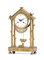 PENDOLA IN BRONZO DORATO, PRIMA META' XIX SECOLO, cassa a tempietto con montanti a tronchi e tetto cimato da colombe, base perlinata con agnello, quadrante smaltato con numeri romani e arabi, suoneria delle ore e delle mezze con pendolo terminante a farfalla; usure e da revisionare.