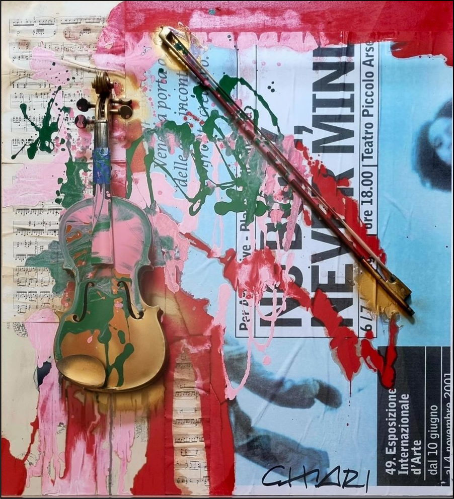 CHIARI GIUSEPPE Firenze 1926 - 2007 "Senza titolo" Tecnica mista ed applicazione di violino su tavola cm 80x90, del 2000. Firmata sul fronte in basso a destra. Contenuta in teca di plexiglass. Autentica su foto a cura del Maestro, certificato di garanzia a cura di Artetivù e certificato di autenticità a cura di Vimarte. Opera pubblicata sul catalogo "Chiari" a cura di AA.VV., a pag. 181.