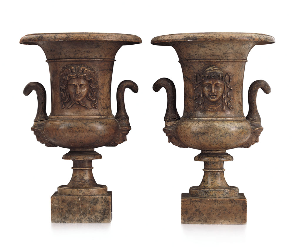 COPPIA DI VASI MEDICI IN ALABASTRO, XIX SECOLO, a due anse centrati da teste di mercurio; qualche sbeccatura.