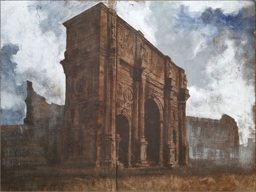 PIGNATELLI LUCA Milano 1962 "Roma" Acrilici e tecnica mista su telone ferroviario cm 80x60. Al verso firma, data, titolo e luogo. Certificato di garanzia a cura di importante casa d'aste svizzera. Autentica su foto a cura del Maestro.