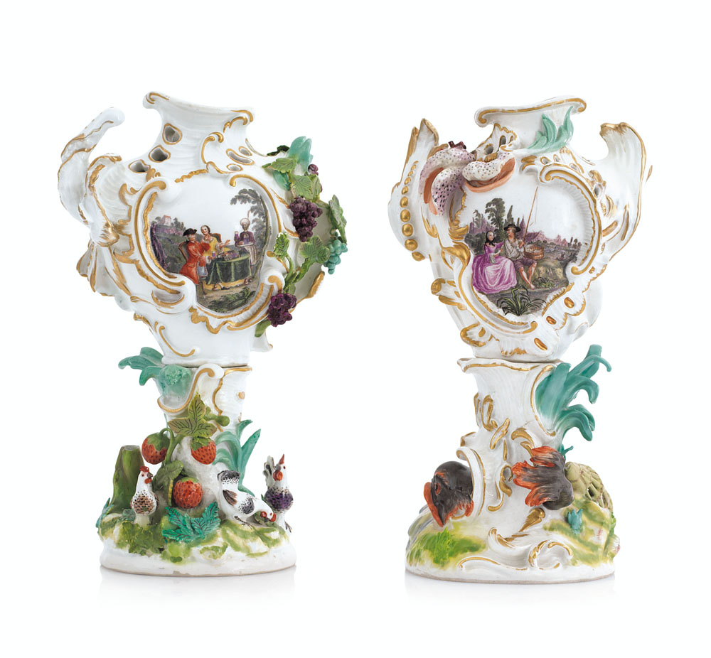 COPPIA DI VASI IN PORCELLANA, MEISSEN, 1750 CA., biansati a rocaille con animali, pesci e frutta applicati, decoro policromo entro riserve con scena galante di pescatore e banchetto con servitore, profili in oro.
