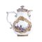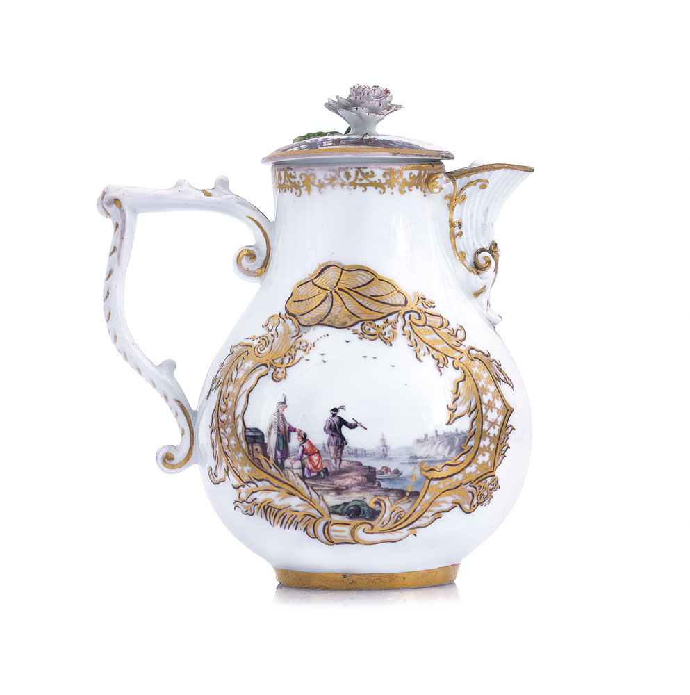 LATTIERA CON COPERCHIO IN PORCELLANA, MEISSEN, 1740 CA., piriforme con manico ad osso e decoro a scene di porto entro riserve a cartigli in oro; lievi restauri e coperchio non pertinente