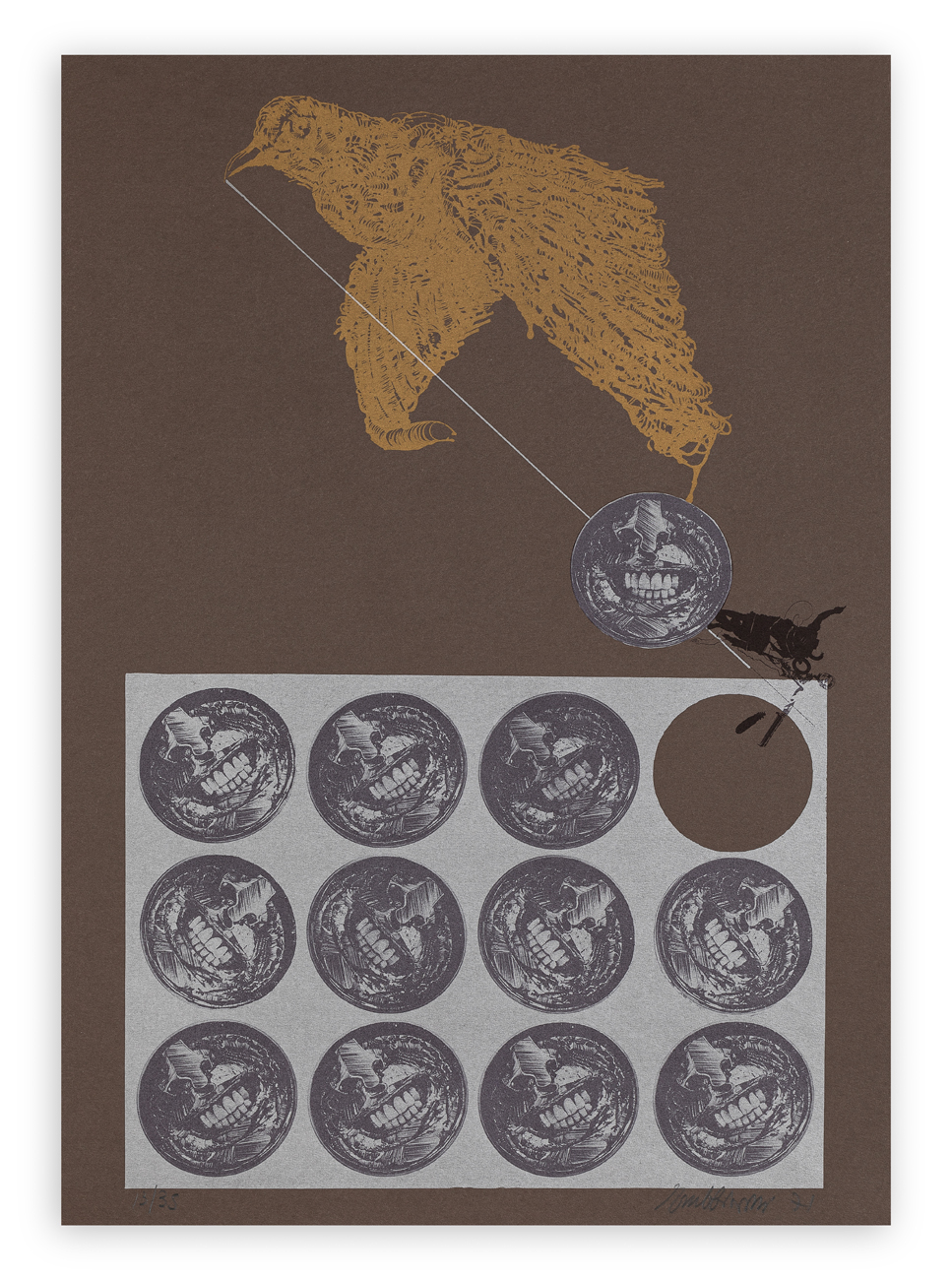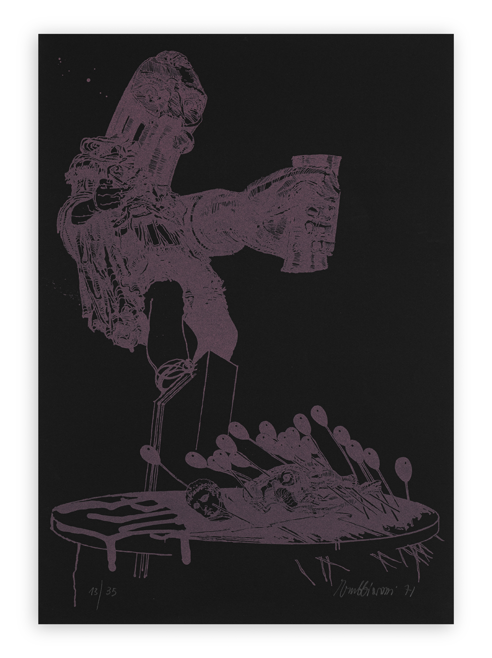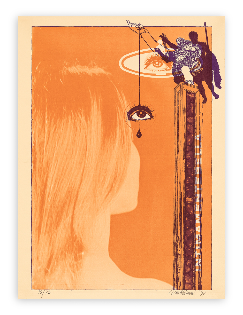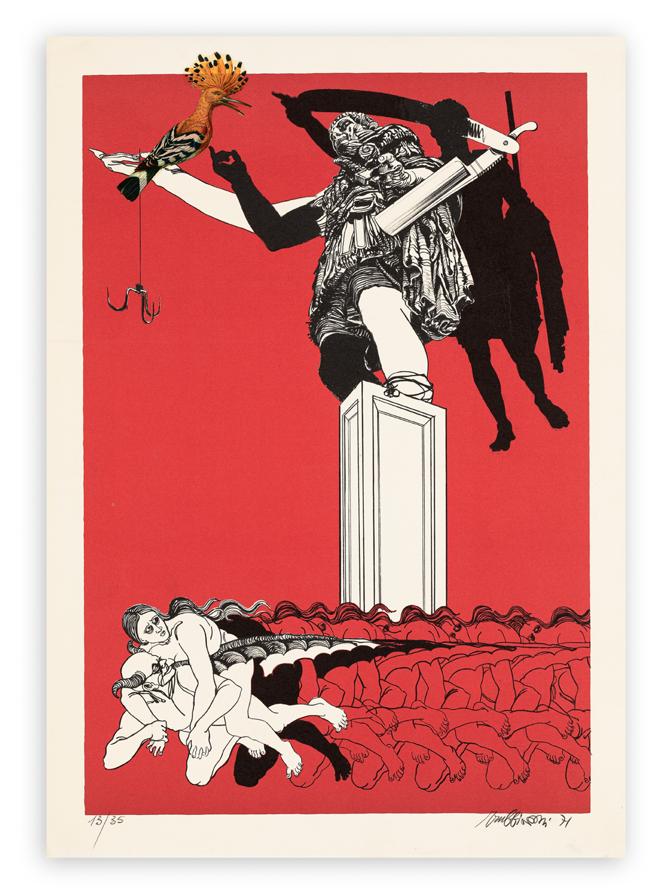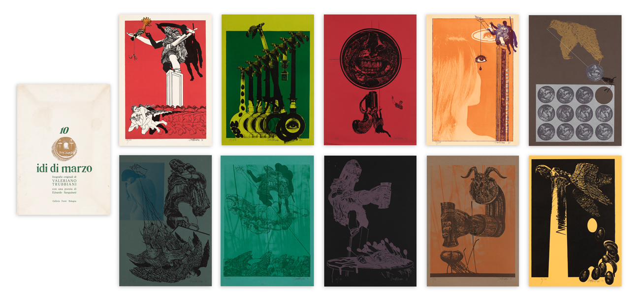 Cartella contenente poesia di Edoardo Sanguineti e 10 litografie originali di Valeriano Trubbiani, ciascuna recante firma, datazione e numerazione (Esemplari 13/35) a matita al fronte