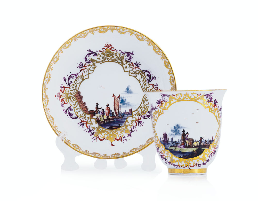 TAZZA CON PIATTO IN PORCELLANA, MEISSEN, 1745 CA., a campana con decoro policromo entro riserve polilobate in oro a scene di porto, profili in oro.