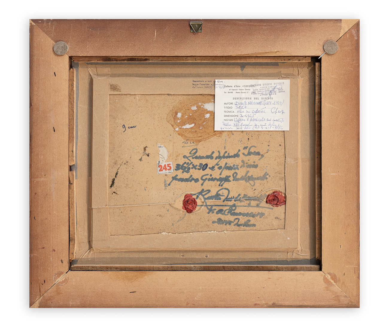Dichiarazione di autenticità del figlio dell'Artista, con doppio timbro in ceralacca, al retro