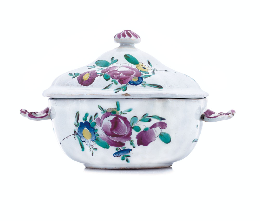 TAZZA DA PUERPERA CON COPERCHIO IN MAIOLICA, LODI, A.FERRETTI, 1770 CA., costolata con decoro policromo a mazzetti floreali; lieve fessura interna.