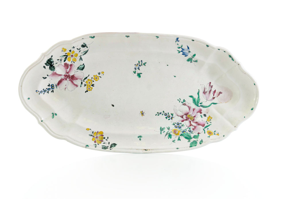PESCIERA IN MAIOLICA, LODI, A.FERRETTI, 1770 CA., decoro policromo a mazzetti di fiori e insetti sparsi.