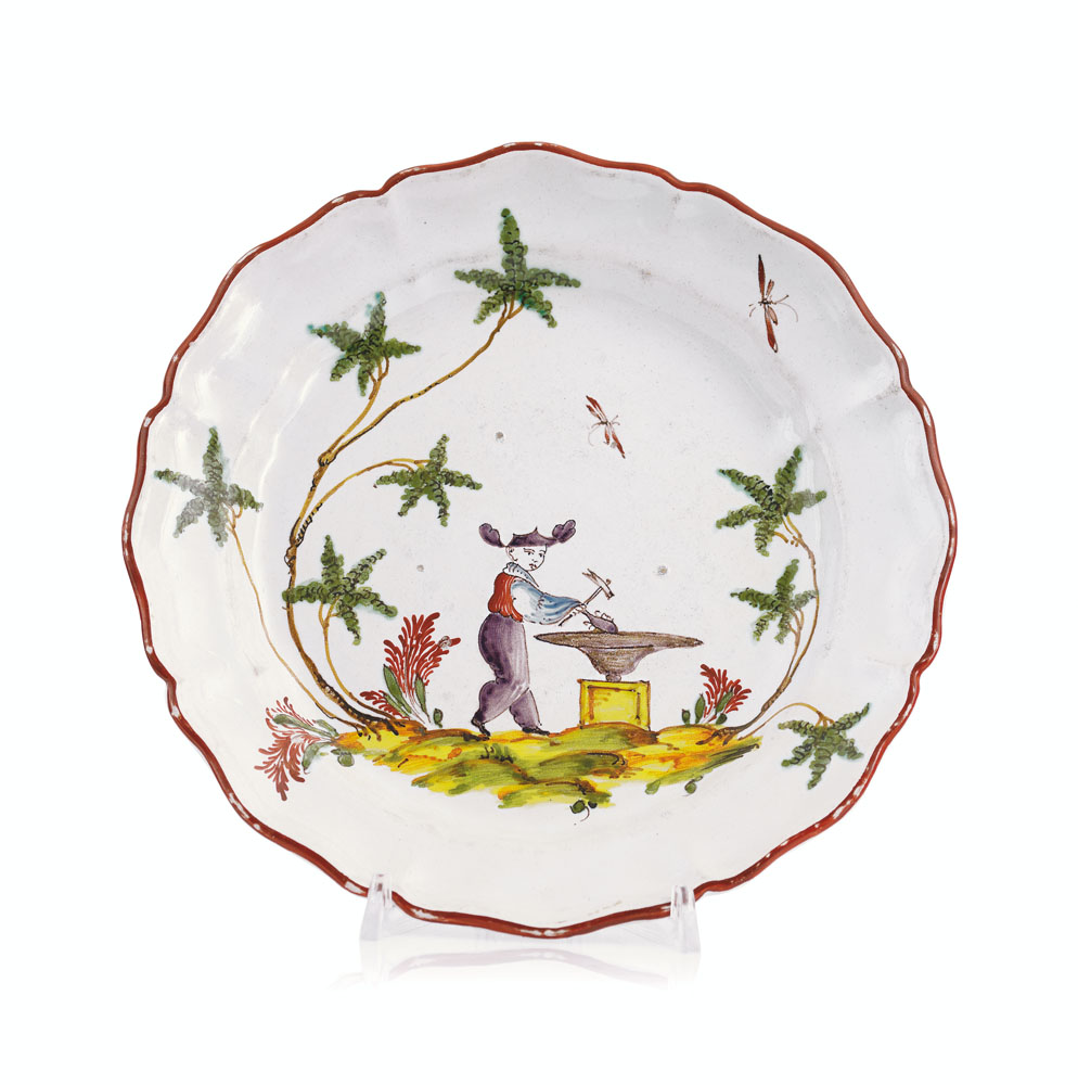 PIATTO IN MAIOLICA, MILANO, F.CLERICI, 1765 CA., decoro policromo a figura di "chinese" con incudine e martello su zolla con vegetazione e insetti.