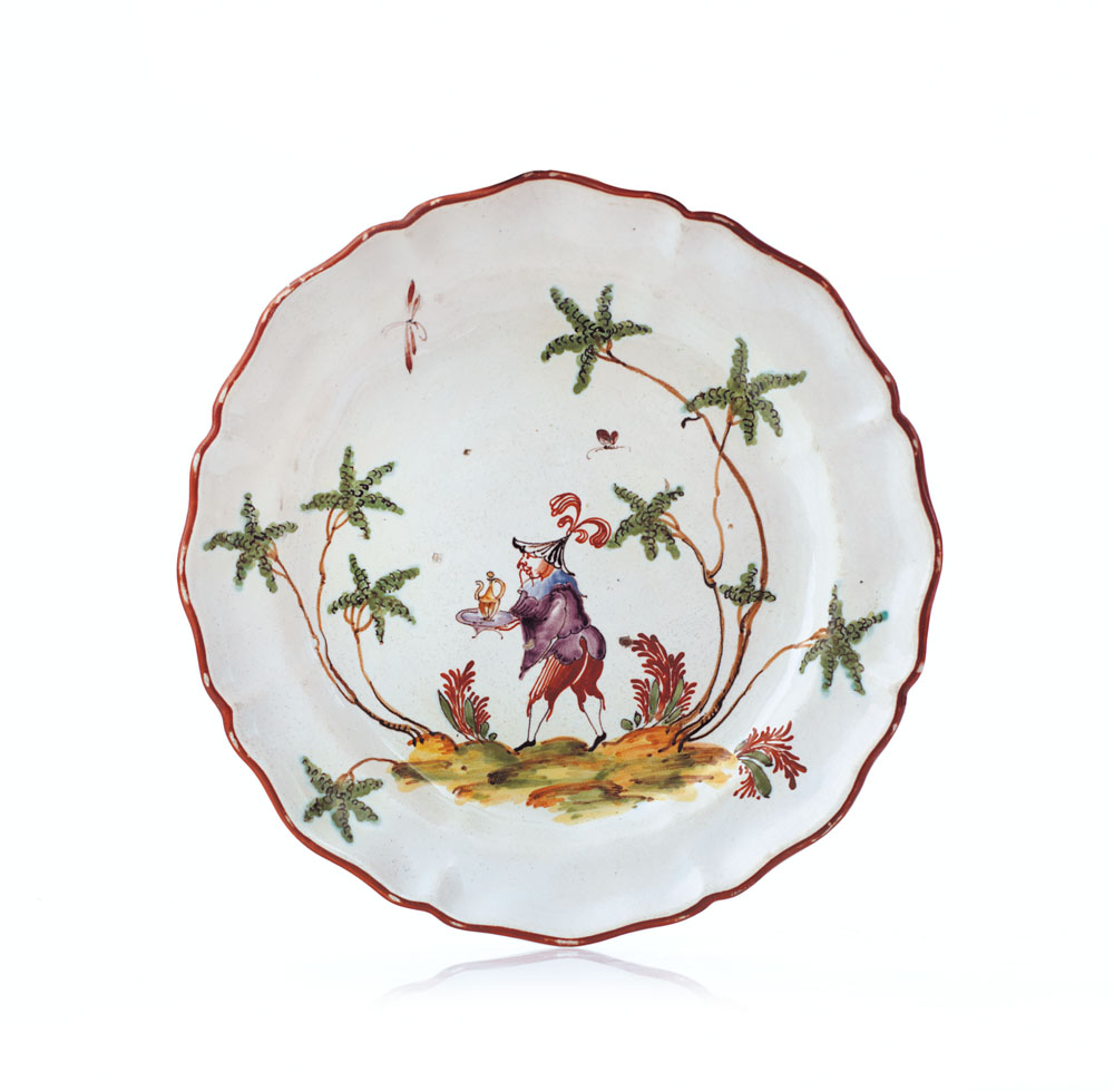 PIATTO IN MAIOLICA, MILANO, F.CLERICI, 1765 CA., decoro policromo a figura di servitore "chinese" reggente vassoio con caffettiera su zolla con vegetazione e insetti.