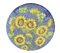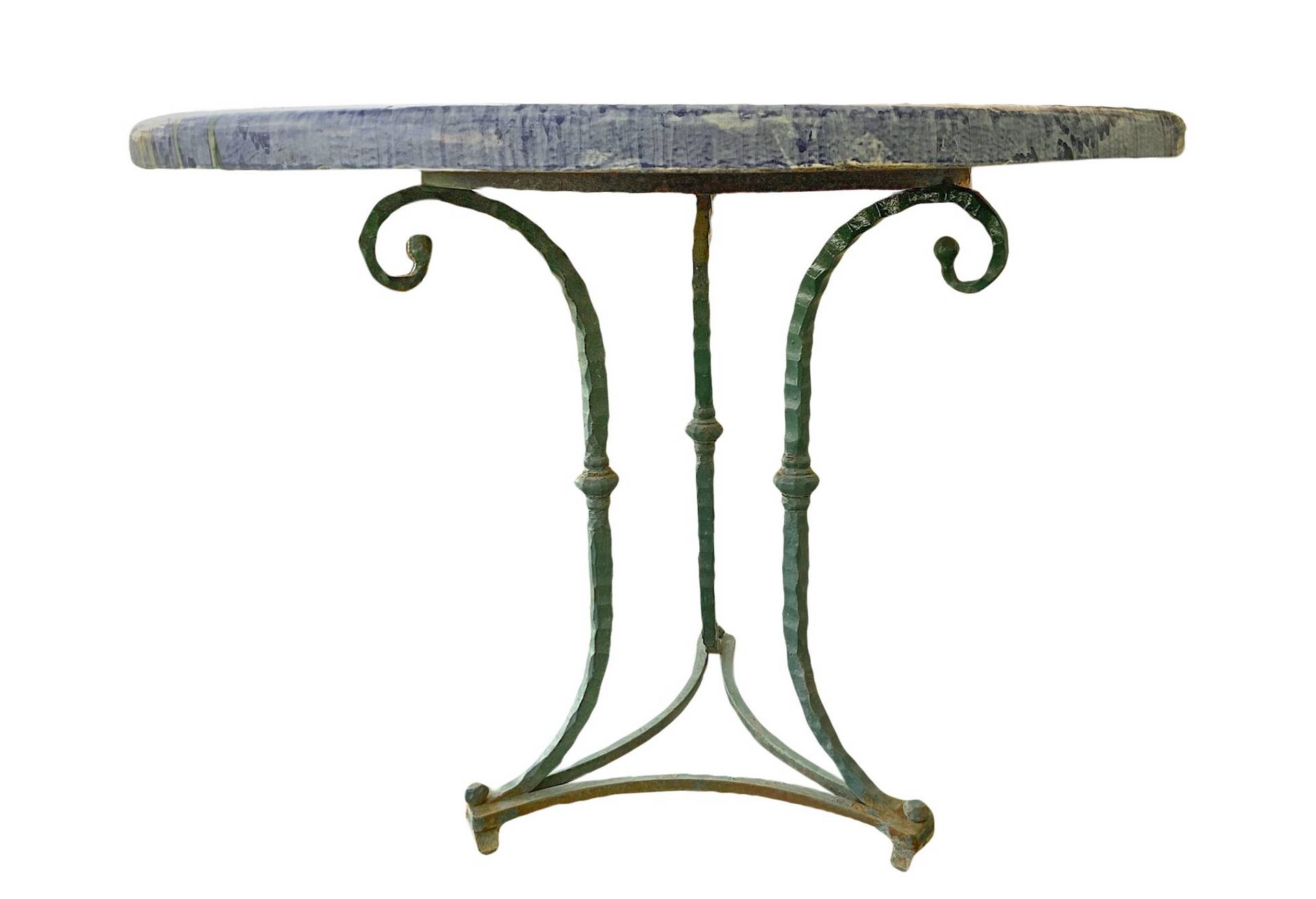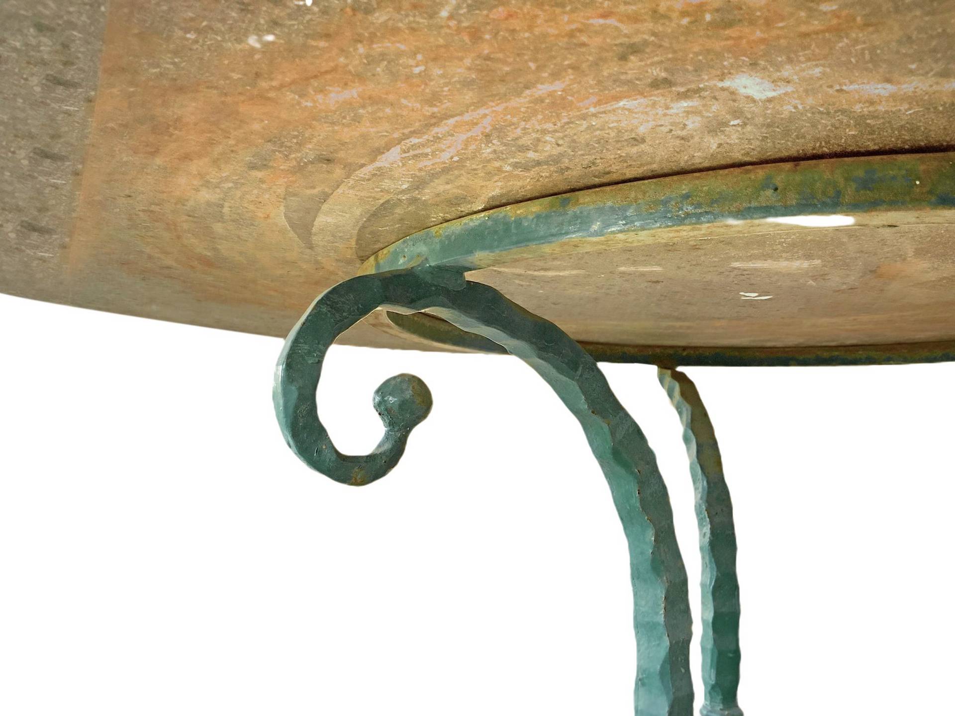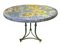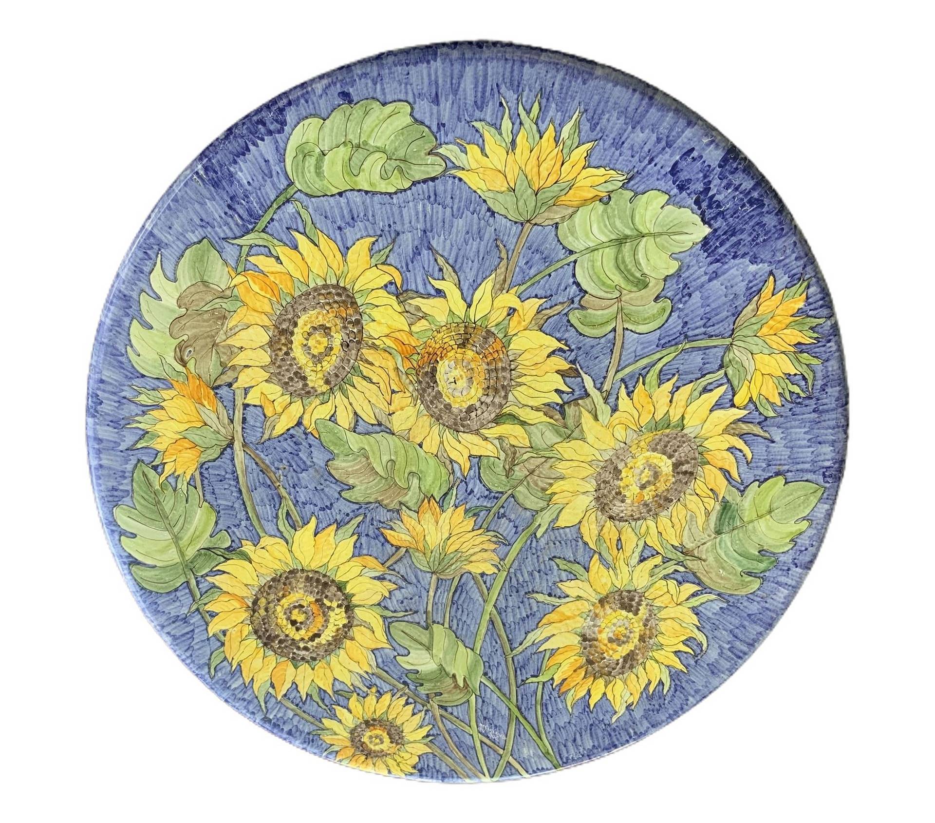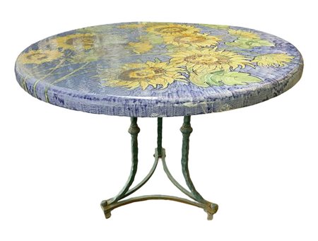 Tavolo rotondo in pietra lavica , 20° secolo H cm 60, diametro cm 80 decorato in ceramica policroma con girasoli al piano. Struttura portante in ferro battuto. Segni d'usodecorato in ceramica policroma con girasoli al piano. Struttura portante in ferro battuto. Segni d'uso