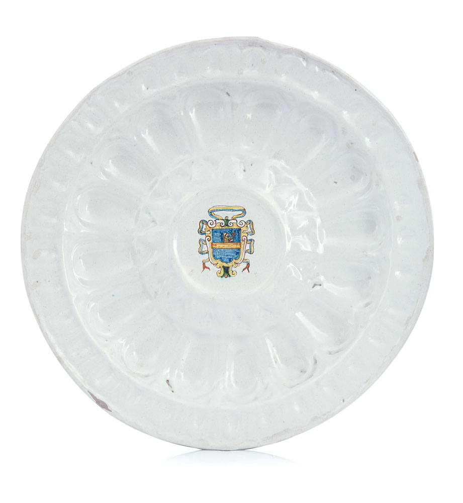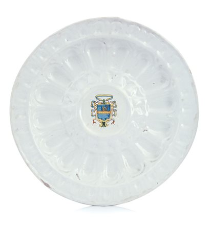 GRANDE PIATTO IN MAIOLICA, DERUTA, XVII SECOLO, bordo rialzato, baccellature, ambone centrato da stemma araldico policromo; difetti minori