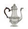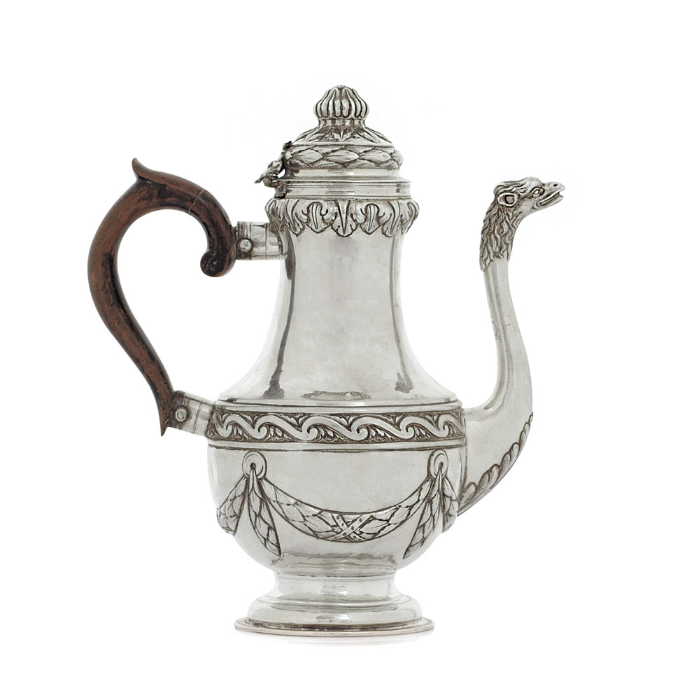 CAFFETTIERA IN ARGENTO, GENOVA, PUNZONE TORRETTA, 1787, piriforme con sbalzi a festoni e meandri su fascia, coperchio incernierato cimato da bocciolo e attaccatura rocaille, base circolare, lungo versatoio terminante a testa di rapace, manico in legno con rincollo; lievi ammaccature.