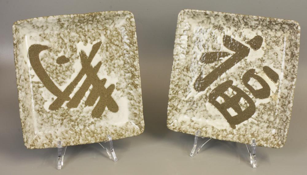 COPPIA DI PIATTI GIAPPONESI in ceramica invetriata e decorati da ideogramma,...
