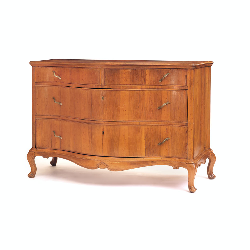 CASSETTONE LASTRONATO IN NOCE, VENETO, XVIII SECOLO, fronte a quattro cassetti e fianchi mossi, piano sagomato e grembiale centinato; restauri e usure.