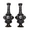COPPIA DI VASI IN METALLO DECORATO A SMALTI, LIMOGES, XIX SECOLO, interamente decorati a grottesche, mascheroni e girali fitomorfe su fondo nero.