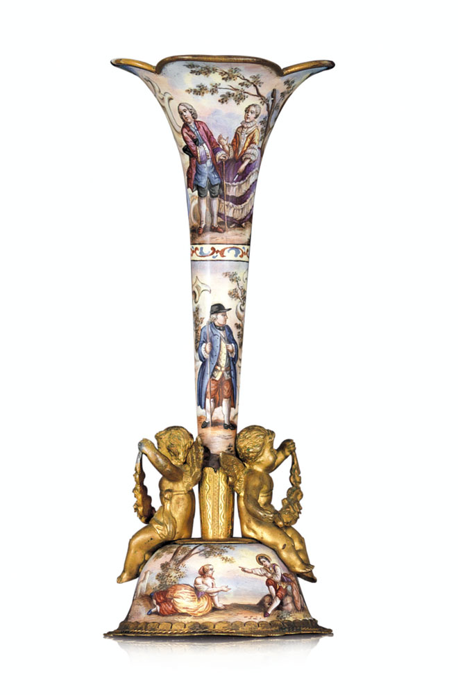 VASETTO IN BRONZO DORATO E SMALTI POLICROMI, VIENNA, XIX SECOLO, a tromba con putti alla base, decori a scene galanti entro paesaggio.