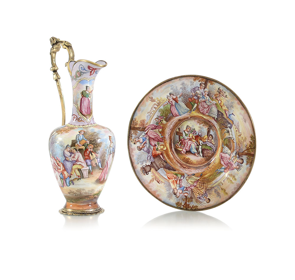 PICCOLO VERSATOIO CON PIATTO IN ARGENTO DECORATO A SMALTI POLICROMI, VIENNA, XIX SECOLO, piriforme con decoro a scene galanti entro paesaggi.
