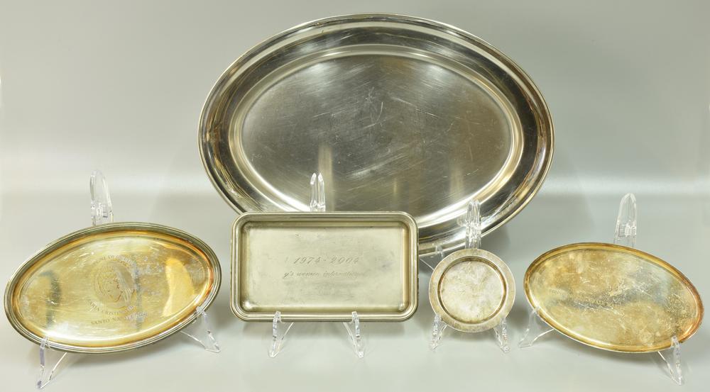 lotto composto da 5 vassoi in acciaio e metallo argentato, di cui:
