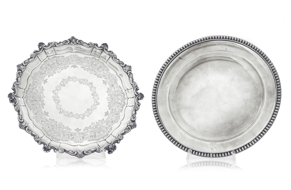 UN SALVER IN ARGENTO, CITTA' DI SHEFFIELD, 1897, circolare su piedini, bordo sagomato a conchiglie e piano inciso, unito a UN PIATTO GIORGIO III IN ARGENTO, LONDRA, 1816, circolare con bordo a ovoli e stemma con motto "Pro Rege" inciso.