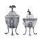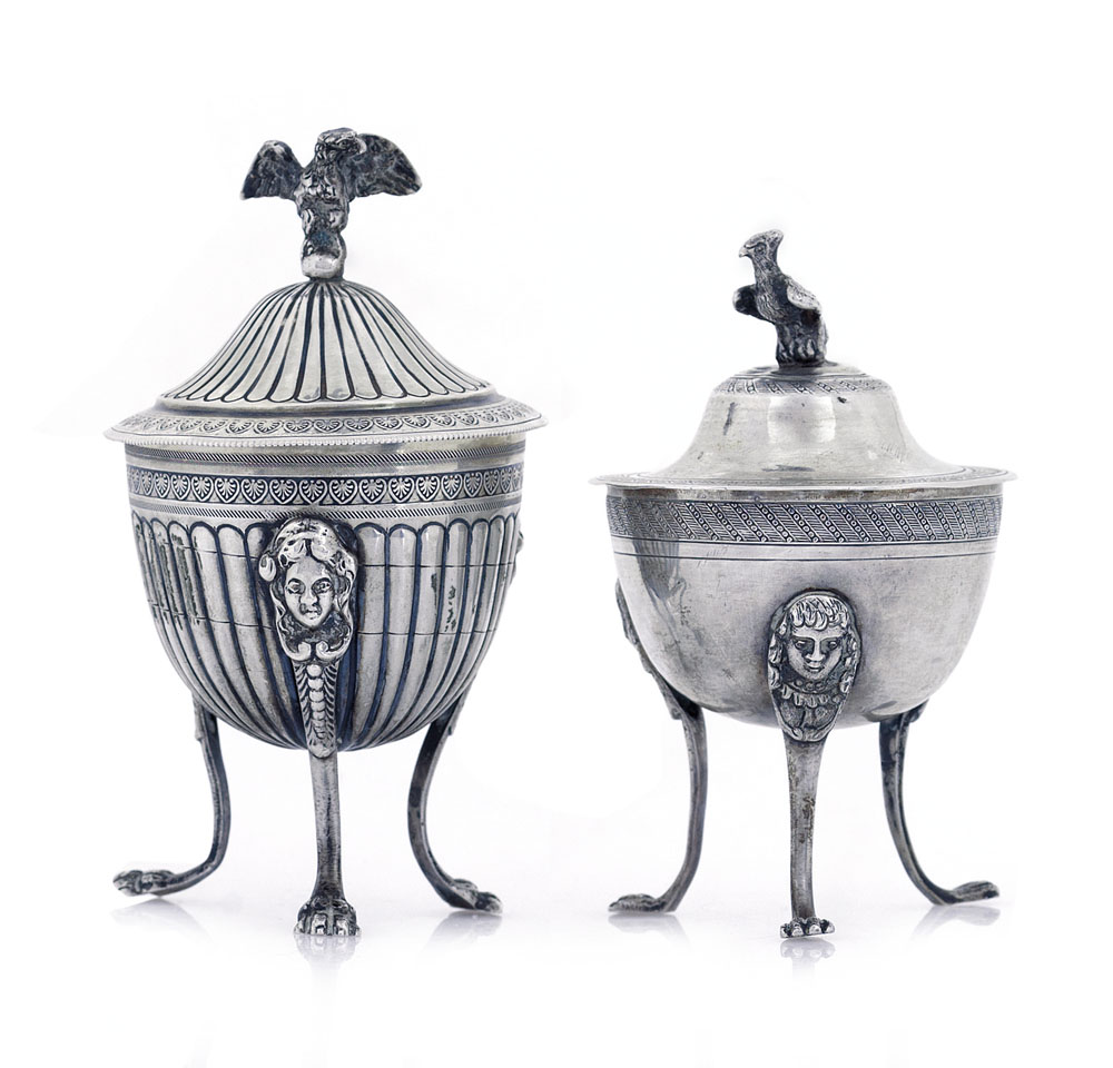 DUE ZUCCHERIERE IN ARGENTO, NAPOLI, 1840 CA. E MILANO, 1930 CA., a coppa con coperchio cimato da rapace su tre alti piedi ferini e teste muliebri.