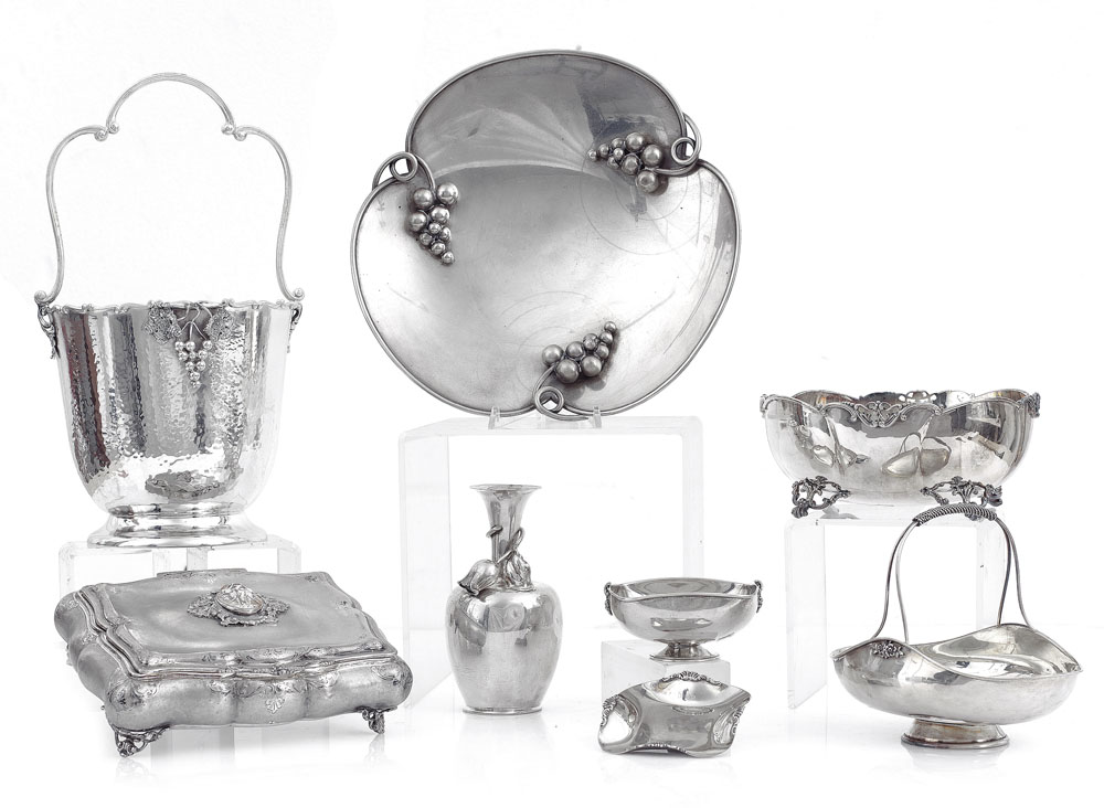 LOTTO DI DIVERSI OGGETTI IN ARGENTO, XX SECOLO, composto un secchiello martellato con manico a voluta, un centrotavola trilobato con decoro a grappoli d'uva, una scatola con coperchio cimato da cammeo, un vasetto, un centrotavola su piedini traforati, una ciotola, un posacenere, un cestino centrotavola con manico; qualche ammaccatura.