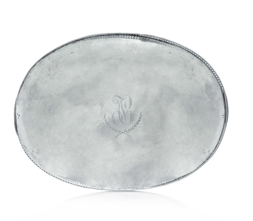 VASSOIO IN ARGENTO, INIZIO XIX SECOLO, ovale con ringhierina traforata, monogramma inciso al centro; lievi difetti.