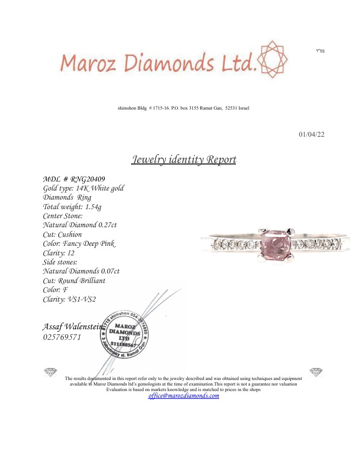 ANELLO IN ORO BIANCO 14K 1.54 GR CON DIAMANTE 0.27 CARATI NATURAL FANCY ROSA INTENSO / PUREZZA I2 + BRILLANTI PER 0.07 CARATI COLORE F PUREZZA VS TAGLIA 6.5 - CERTIFICATO GEMMOLOGICO MAROZ DIAMONDS LTD MEMBRO ISRAEL DIAMOND EXCHANGE - RNG20409