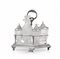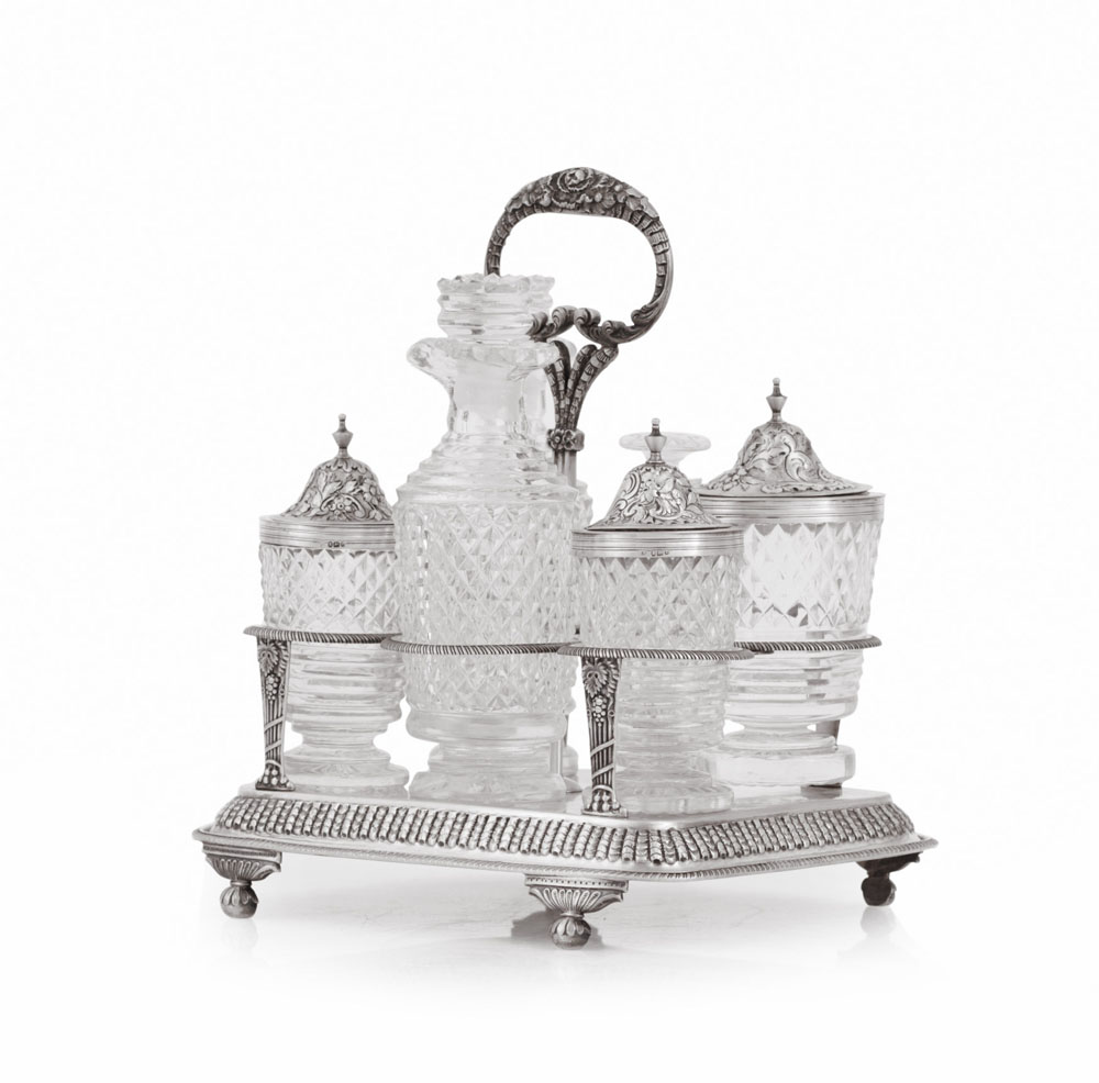 CRUET GIORGIO III IN ARGENTO, LONDRA, 1810, ARGENTIERI P.&W.BATEMAN, rettangolare su piedi a sfera con bordi godronati, sei ampolle e contenitori in cristallo e argento coevi; lievi sbeccature.