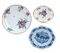 DUE PIATTI IN MAIOLICA, FAENZA, XVIII SECOLO, decoro alla "mezza rosa" e a mazzetti, uniti a UN PIATTO IN MAIOLICA, XVIII SECOLO, con decoro floreale blu; restauri e rincollature.