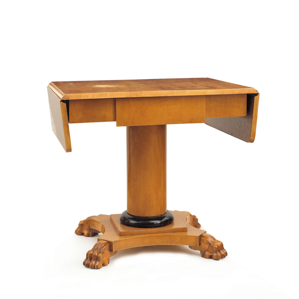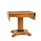 TAVOLO BIEDERMAIER IN LEGNO CHIARO, XIX SECOLO, piano con alette laterali incernierate e sostegno centrale a colonna; sbeccature e usure.