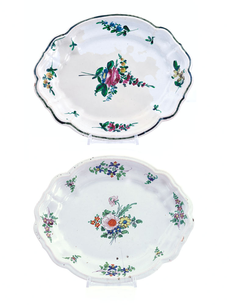 DUE PIATTI OVALI IN MAIOLICA, FAENZA, FERNIANI, SECONDA META' XVIII SECOLO, un con decoro policromo floreale detto "mezza rosa"; restauro, e uno con decoro floreale policromo o "fiorazzo"; fessura chiusa da graffe.