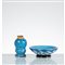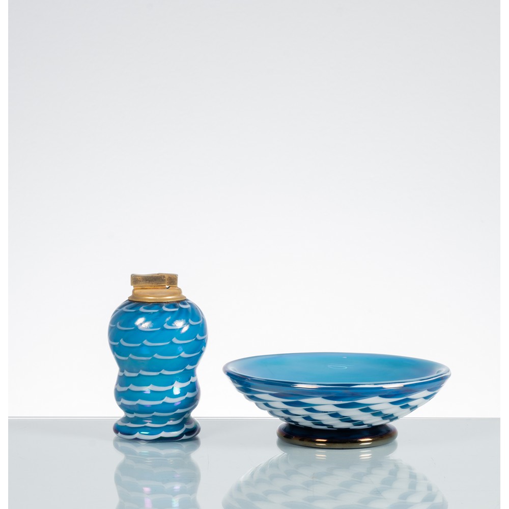 Una ciotola semisferica con bocca piana circolare ed un accendino in vetro fenicio blu, lattimo e ottone, base in vetro nero. Etichetta di produzione.