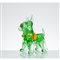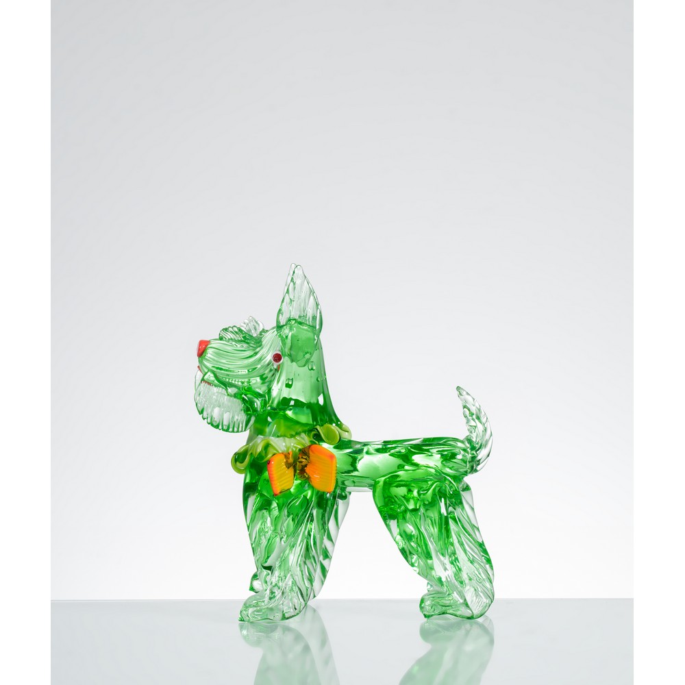 Figura di cane terrier in vetro verde, particolari in vetro rosso e arancione.