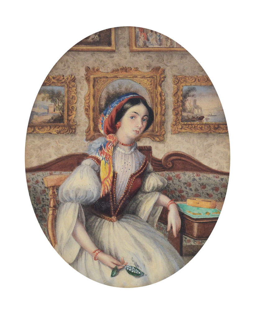 PITTORE DEL XIX SECOLO Ritratto di gentildonna in un internoTempera su carta...