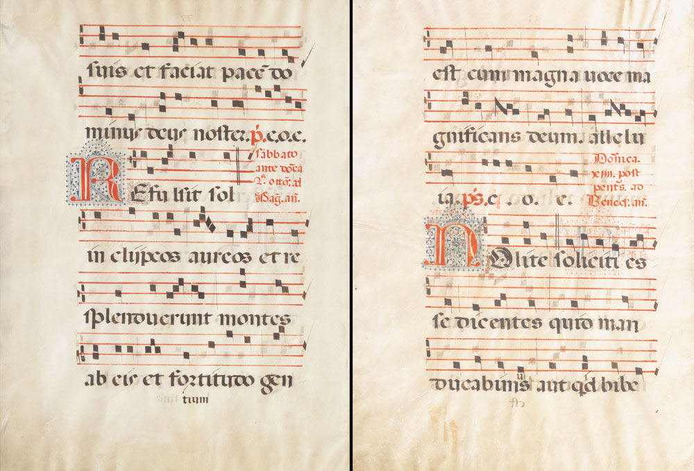 PITTORE DEL XVIII SECOLO Due pagine di antifonarioTempera su pergamena, cm...