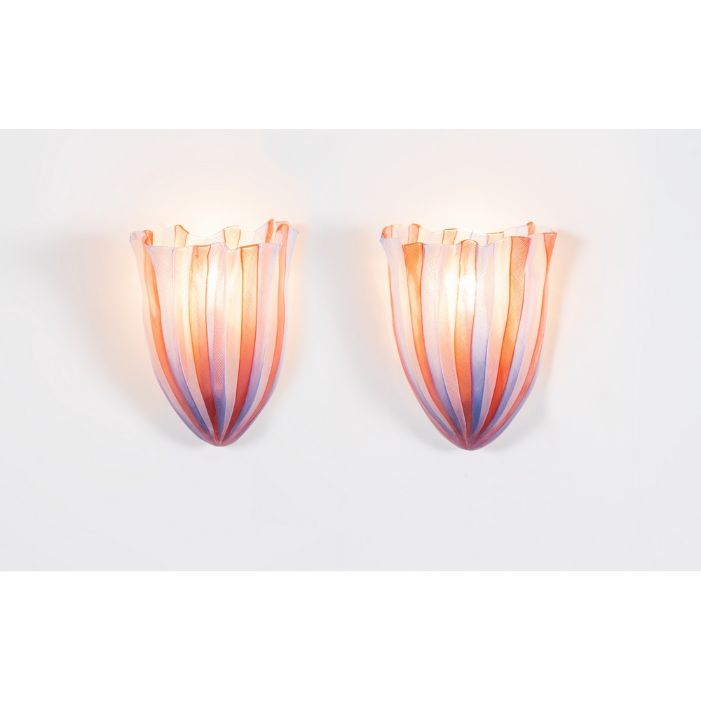 Rara coppia di lampade da parete a “Fazzoletto” in vetro soffiato zanfirico a canne lattime, rossa e azzurrine. Documento originale di acquisto.