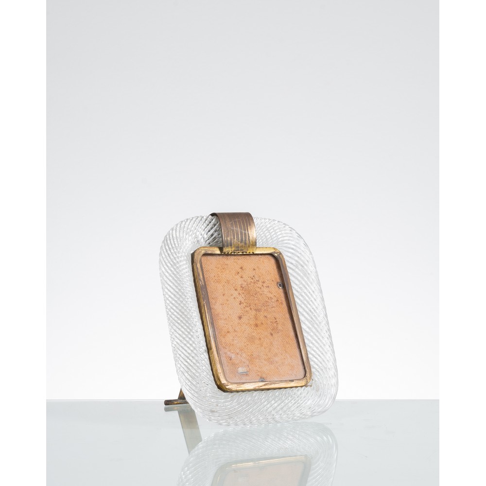 Cornice portafoto in vetro incolore lavorato a torchon con montatura in ottone, struttura in ottone.